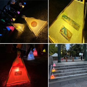 「やきもの」をイメージしたオレンジ、「雄大な自然・里山」をイメージしたグリーン、2種類のLEDランタンとまちを彩り願いを記したLED三角灯籠。 瀬戸の持つ根源的な魅力を再認識し皆で発信していきたいという想いで南山大学所属NanzanAIDの清水さん、青木くん、津野くん、そしてスタッフの学生の皆さんと一緒に企画してきました。