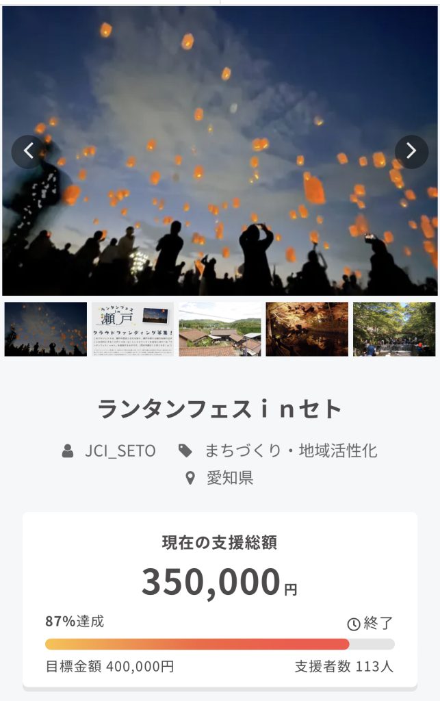 10月14日(土)に開催させていただく「ランタンフェスinセト」の実施に向けクラウドファンディングを実施させていただき、期限の9月22日(金)までに35万円という多大なるご支援をいただくことができました。ご支援いただきました皆様本当にありがとうございます。