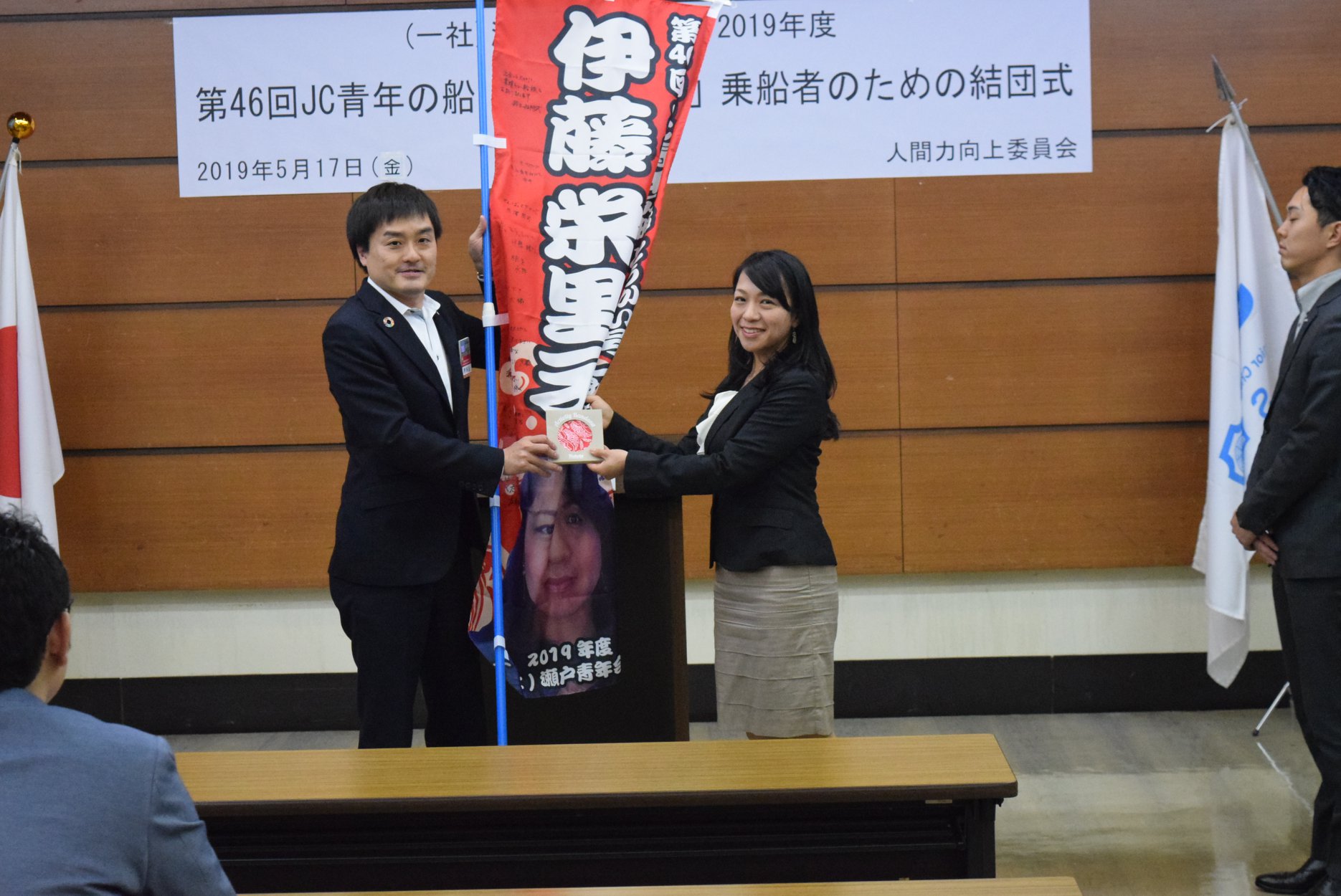 5月17日(金)に瀬戸商工会議所において、瀬戸青年会議所より一般乗船者として推薦させていただいた伊藤栄里子さん・木邊研翔さんをお迎えして、乗船者の方に、メンバーからの激励の想いを伝え、乗船に対する不安や疑問を少しでも解消する機会を設けることで、共に乗船する仲間達との交流や研修に対して前向きに取り組む意識を高めることを目的に(一社)瀬戸青年会議所2019年度第46回JC青年の船「とうかい号」乗船者のための結団式を開催いたしました。