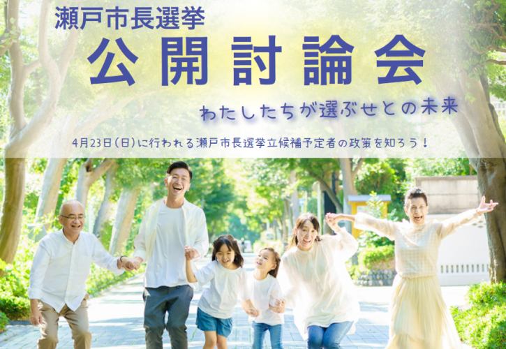 4月事業として4/12(水)18時30分~瀬戸蔵2階つばきホールにて瀬戸市長選挙公開討論会を開催します。